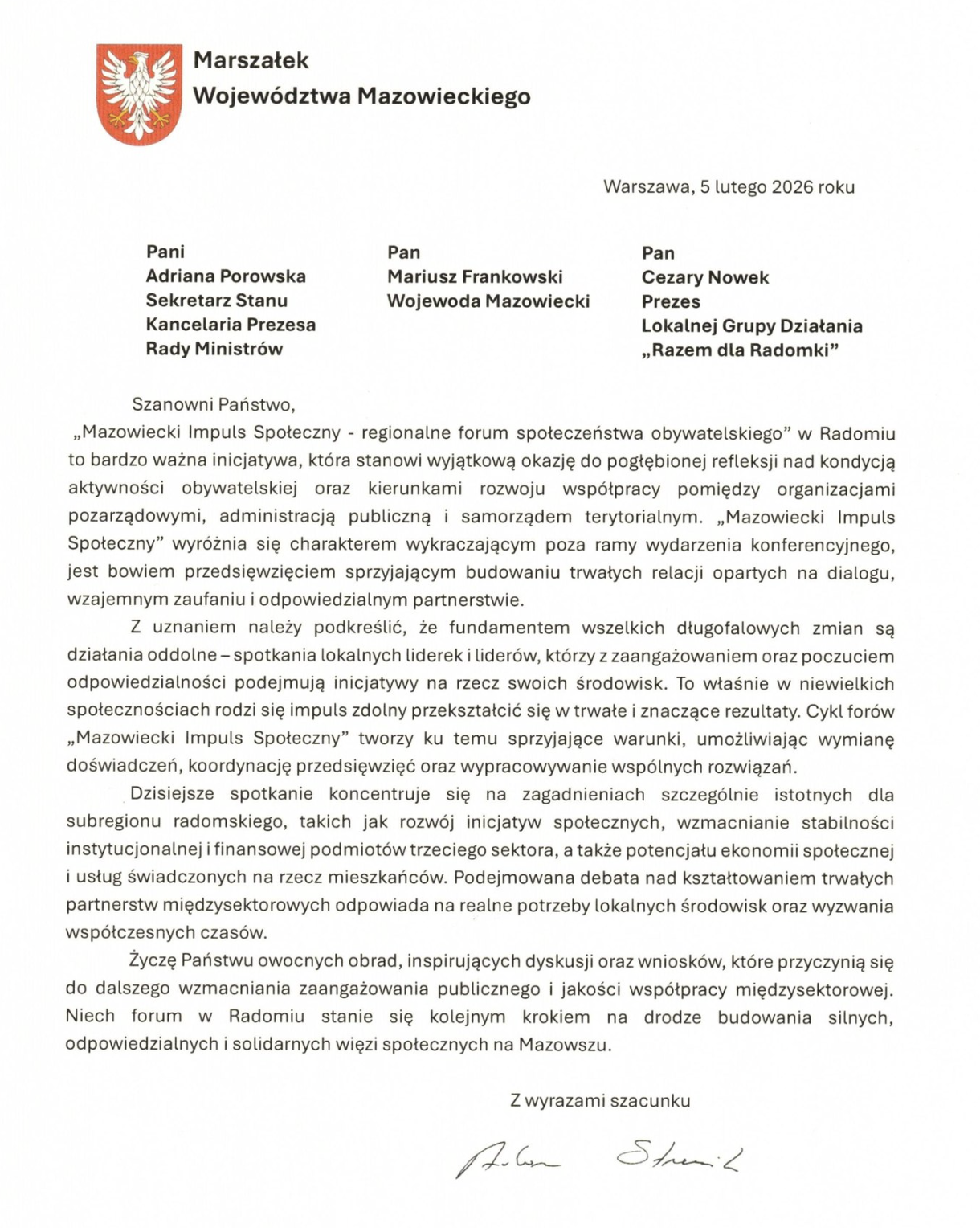 Radomska edycja Mazowieckiego Impulsu Społecznego była refleksją nad aktywnością obywatelska w różnych środowiskach, działaniami podejmowanymi przez administrację rządową, samorząd terytorialny, ngo-sy na rzecz budowania społeczeństwa obywatelskiego, odporności społecznej.