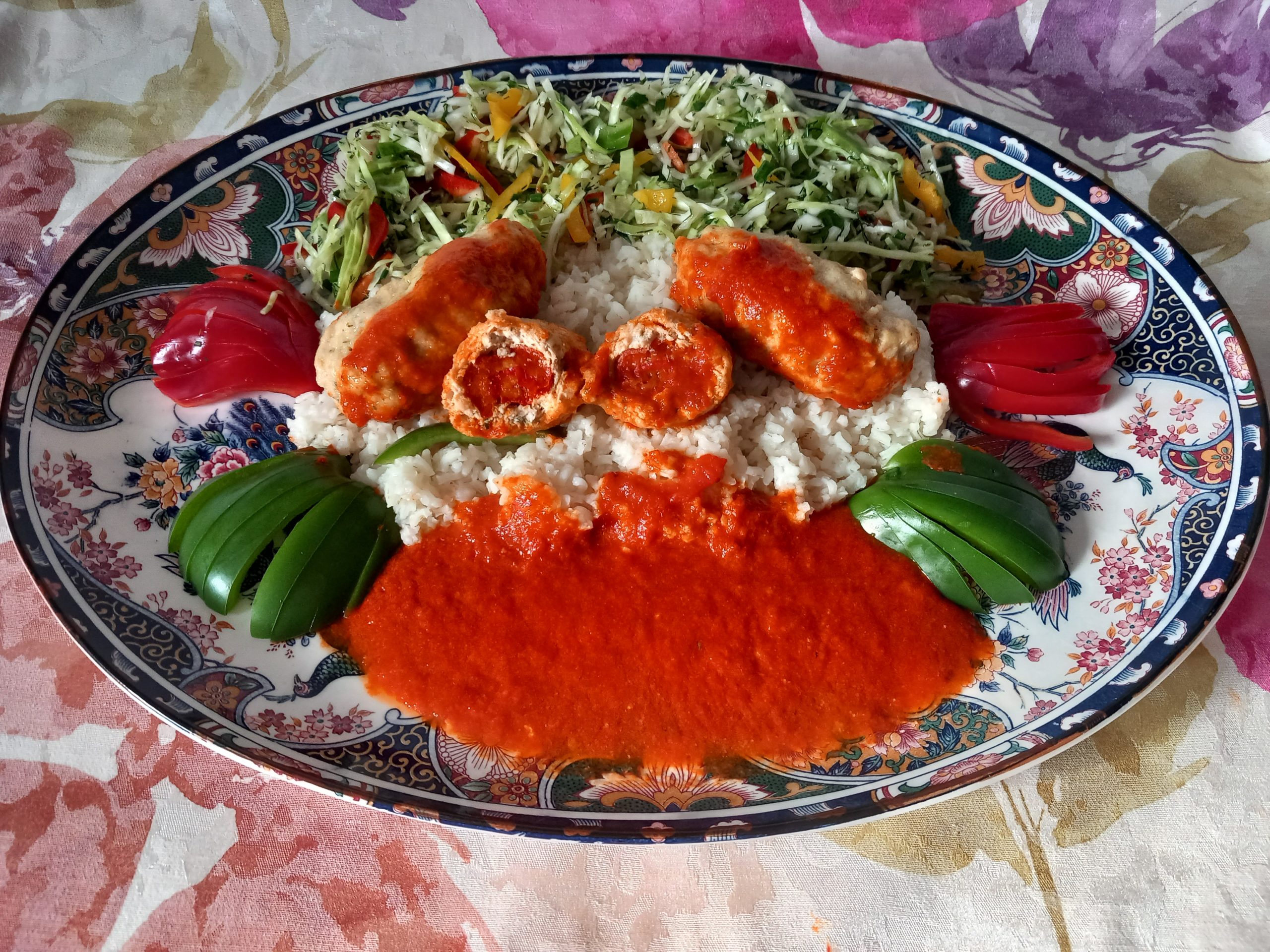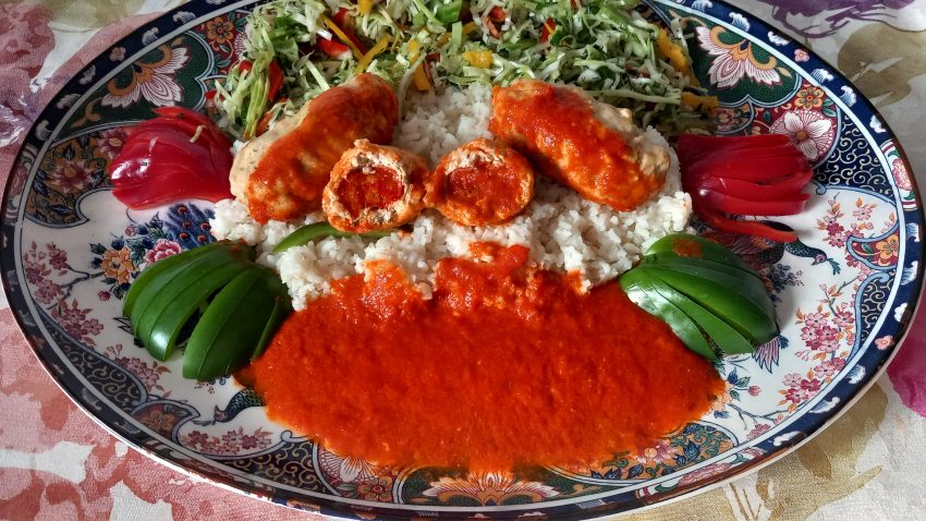 Pulpety z indyka faszerowane pieczoną papryką w sosie paprykowym